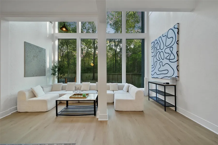 Prime location, NO rear neighbors, & close to all The Woodlands has to offer. Stunning contemporary designed split-level home is a must-see w/ NEW wood floors in common areas & bedrooms, new lighting, FRESH interior/exterior paint, & electrical panel (can charge electrical car). With the convenience of an elevator, you can take to each level. The entrance brings lots of natural light w/ floor to ceiling windows. On this level you will find a spacious living area, secondaries, & utility. Entertain in your QUARTZ kitchen w/ stainless steel electric range, oven, showcase cabinets, lots of counter space, & walk in pantry. Saving the best for last on top level is the primary retreat w/ private balcony, soaking tub, oversized rain shower w/ bench seat, & his & her walk-in closets along w/ a home office space. The basement space (can be a flex space, GAMEROOM, or man cave) includes a wine cellar. COVERED back patio. ZONED TO WOODLANDS SCHOOLS. Near lots of parks & shopping. CALL TODAY!
