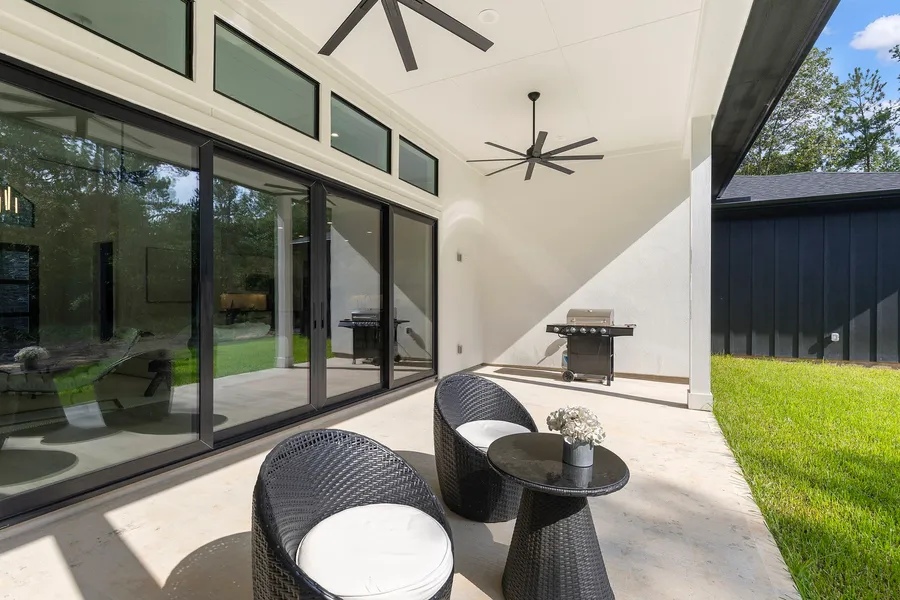 Built by Design Tech Homes, this 3,225 sq ft home combines modern elegance with relaxed living in Republic Grand Ranch. Situated on a private, wooded 2-acre lot, the open-concept design is perfect for both entertaining and everyday living. The gourmet kitchen features an oversized waterfall island and a large walk-in pantry. The dining room offers expansive views of the wooded backyard, creating an inviting space for meals with family and friends. The spa-like primary bath provides easy access to his and hers closets. A spacious back patio overlooks the serene wooded lot. The home includes 3 bedrooms, 3.5 baths, a study, game room, utility room, and oversized 3-car garage. High ceilings (10 ft+ throughout with 12 ft game room and 13 ft family room) add to the home’s airy, spacious feel.