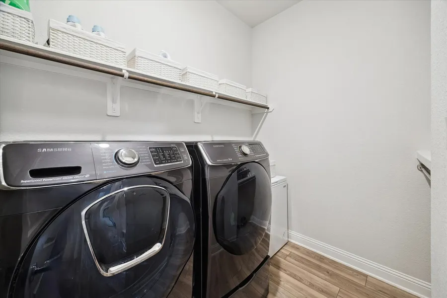 This stunning 4-bed/3.5-bath home in Woodson Reserve features a 3-car tandem garage and a light-filled foyer with soaring ceilings and an elegant curved wood staircase. A private office with French doors, a dramatic two-story living room, and open-concept living with luxury vinyl plank flooring make entertaining effortless. The chef’s kitchen offers shaker-style cabinets, a walk-in pantry, an oversized quartz island with seating, stainless-steel appliances, and a 5-burner gas cooktop. The primary suite features a spacious layout for king-size furniture, dual sinks with a soaking tub and glass-enclosed shower, plus a spacious walk-in closet. Upstairs, the game room overlooks the living area. The first-floor powder bath, mudroom with built-ins, and bright laundry room add convenience. Outside, enjoy a covered patio with a gas hookup and a sprinkler system. Residents have access to lakes, a resort-style pool with a lazy river, fitness center, playgrounds, dog parks, and nature trails.