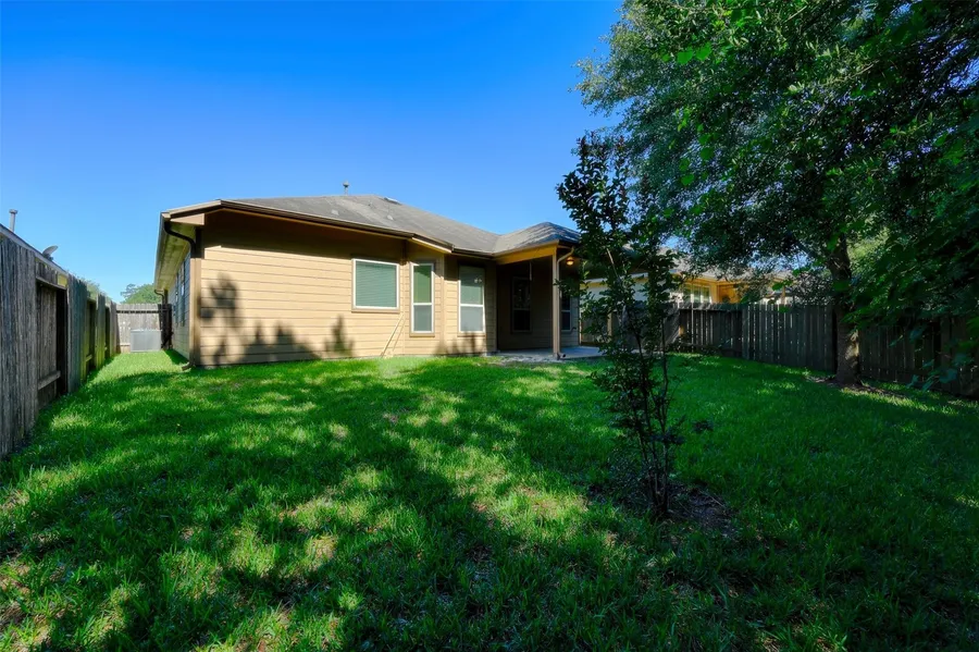SELLER IS MOTIVATED!! This pristine one-story home combines comfort, style, and an unbeatable location just minutes from I-45, Conroe, and The Woodlands. Conveniently located off FM 2854, you’ll be close to shopping, dining, and medical facilities. The open-concept design offers a bright and spacious living room filled with natural light and a beautifully updated kitchen featuring quartz countertops and a sleek glass tile backsplash. Easy-care laminate flooring flows throughout the main living areas, creating a warm and cohesive feel. The split-bedroom layout includes two guest rooms with a shared full bath on one side and a generous primary suite with a private ensuite bath on the other. Step outside to a peaceful, shaded backyard with full fencing and a large covered porch—ideal for outdoor relaxation or entertaining.
