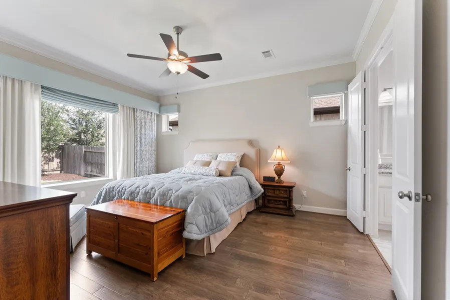 Beautiful one-story upgraded home in desirable Grand Central Park, a master-planned community near I-45 and The Woodlands. This open-concept layout features a spectacular foyer with rotunda ceiling leading to a spacious family room, large kitchen with new appliances, and casual dining area. The kitchen includes quartz countertops, beautiful backsplash, extra large island, a built-in cooktop, stainless steel appliances and under-cabinet lighting. Luxury engineered hickory wood flooring runs throughout the main living areas. The luxurious primary suite offers a large walk-in closet, soaking bath and dual sinks. Three additional bedrooms and a home office/study. One bedroom and study could easily be converted into a guest suite. Relax on the covered back patio or enjoy community amenities like trails, fully stocked lakes, pickle ball courts and nearby shopping and dining. Smart home features, high ceilings, and energy-efficient design complete this functional and stylish home.