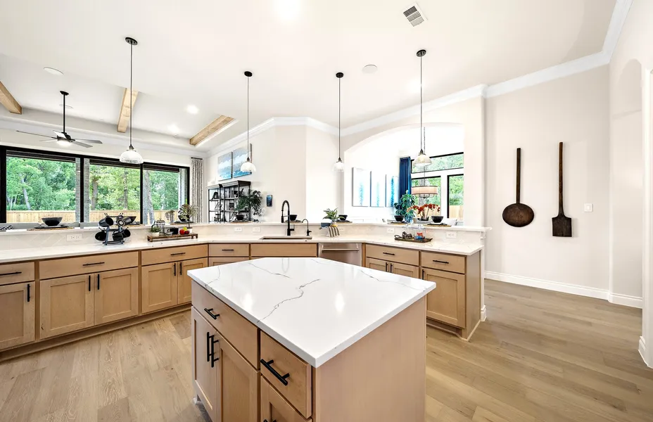 1-story open concept floor plan features an extended entry with 13’ ceilings. An expansive kitchen is the heart of this home, featuring abundant cabinet space, working island, and a high bar with seating. The large family room has a full wall of windows, a corner fireplace, and a 3 panel sliding glass door. The master bedroom boasts 13’ ceilings and a luxurious master bathroom which includes His and Hers sinks, centrally located tub, and a large walk-in closet. Oversized 25’ wide covered patio overlooks the backyard.