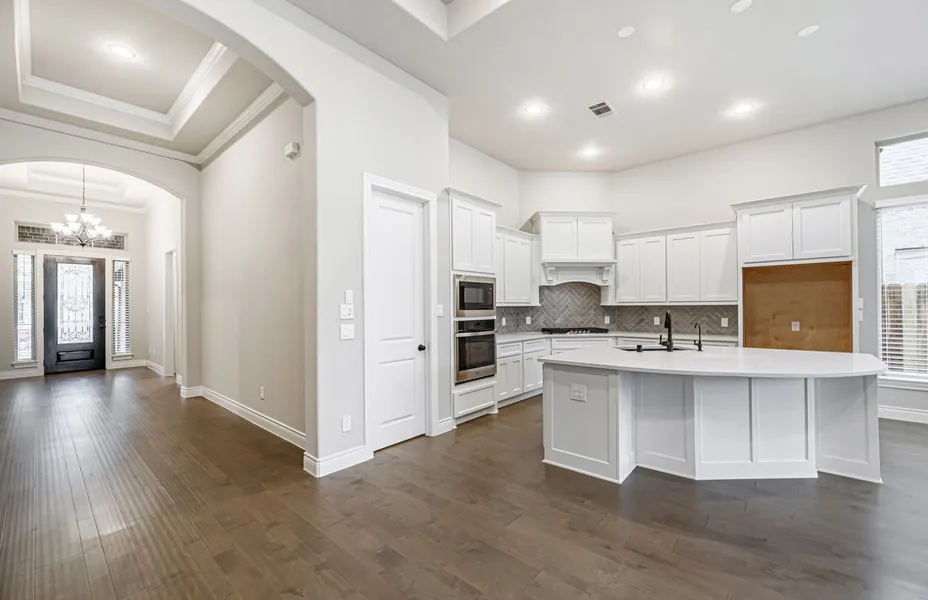 1-story floor plan features an entry and extended entry with 13’ ceilings, a large 17’x27’ family room includes a centrally located fireplace and a full wall of windows. An open concept kitchen includes abundant cabinet space and a casual dining area. The master bathroom hosts His-and-Hers sinks, a freestanding tub, and a separate shower. Oversized 28’ wide covered patio overlooks the spacious backyard.
