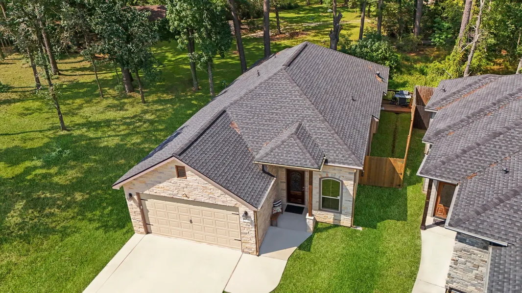 This gorgeous home features 3 Bedrooms & 2 Full Baths located in the Lake Chateau Woods Community! Home is ready whenever we close and are funded. This home features an elegant cultured stone exterior, making for a great first impression! High-end finishes throughout. High ceilings throughout (15 ft foyer, 12 ft living, 10 ft elsewhere)! The open-concept kitchen features Granite countertops, custom designer wood cabinets, an island with tons of additional counter & storage space, and built-in Stainless Steel Samsung appliances! Spacious Primary & Secondary bedrooms. Modern style tile & laminate flooring throughout, NO CARPET! Easy access to I-45 and proximity to all that The Woodlands has to offer! Schedule your private showing today! This beautiful home also features numerous upgrades, a Backwood Deck, Full gutters and Guards, Exterior Soffit lights with Wi-Fi remote functions, a driveway widening, a side privacy fence, garage shelving, and a gas Generator adaptor—NO BACK YARD.