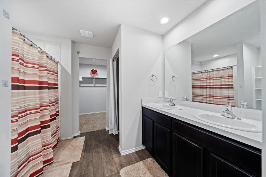 Privately located primary suite offers a luxurious bath with separate tub and shower, plus a large walk-in closet. Generously sized secondary bedrooms and full baths provide space for everyone. Home includes tankless water heater, built-in home automation system, and covered patio, no back neighbors and greenbelt views for added privacy and tranquility.