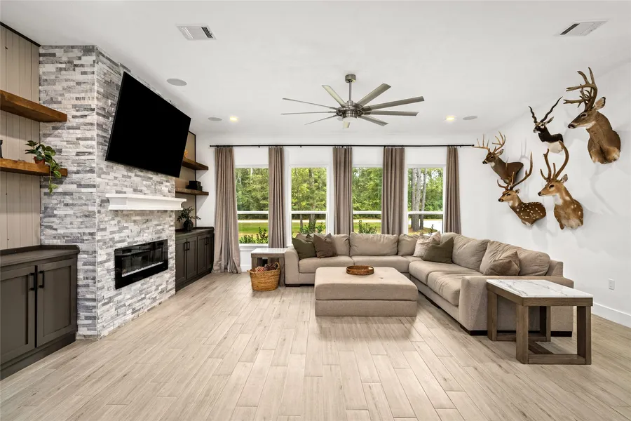 Beautiful custom-built home in Peach Creek Plantation on a quiet one-acre lot with mature trees. This home features a spacious open floor plan with high ceilings. The family room offers a modern fireplace with new custom built-ins, floating shelves, and cabinetry for extra storage. The kitchen boasts a large stone-front island, 42" soft-close cabinets, quartz countertops, stylish backsplash, and updated pendant lighting. A farmhouse fixture accents the dining area, and durable tile flooring flows throughout the main spaces. The primary suite includes a tray ceiling and barn door leading to a bath with an oversized shower with bench and three shower heads, soaking tub, and large walk-in closet with built-ins. The laundry room has designer tile, custom cabinets, and a utility sink. Relax on the expanded covered patio with dual ceiling fans. Community amenities include fishing lakes, playgrounds, walking trails, and picnic areas.