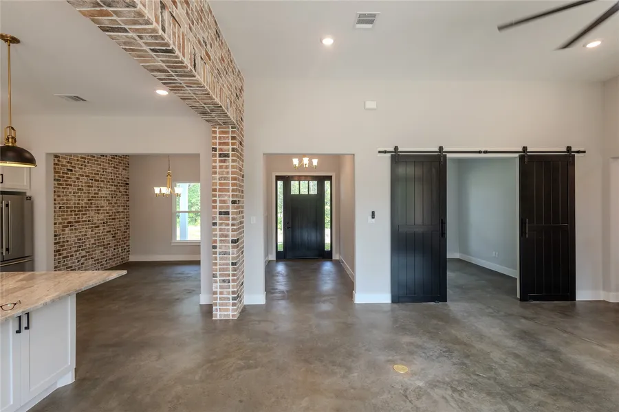 Newly completed, never lived in and move-in ready Modern Farmhouse situated on a private 1.65 wooded acre lot in Republic Grand Ranch. It features a large kitchen with granite countertops and built-ins throughout. The open concept design is perfect for entertaining and features natural sealed concrete floors. Home has Forno kitchen appliances, a 1000 Gallon Propane Tank (80% full), whole house surge protector, Reolink, Home Exterior Surveillance System, Cat6 wiring, Gutters and a Sprinkler System. Other additions are High Speed Fiber Optic already at property, rough-in for future water softener, (3) prewired 30 amp connections for future Generator, Front Gate or Shop Barn. Property includes underground utilities with no MUD tax. It is minutes from shopping, dining, schools, hospitals and entertainment. Ideal for those seeking a serene lifestyle with nearby access to modern conveniences.