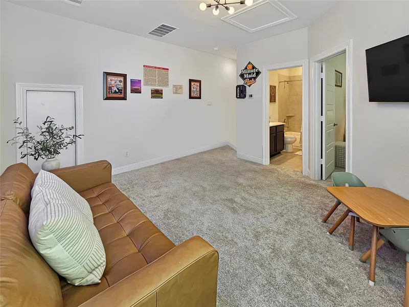 Outside, a 740 sq ft travertine patio, custom putting green, mature landscaping, & a fully sprinklered yard create an ideal low-maintenance space for everyday use and entertaining. A gas line is ready for a future outdoor kitchen. Additional upgrades include a hardwired generator hookup, & decked attic. With no homes across the street, the property offers added privacy, convenient guest parking, & a short walk to the mailbox, and close to IAH, I-45, and Hwy 99.