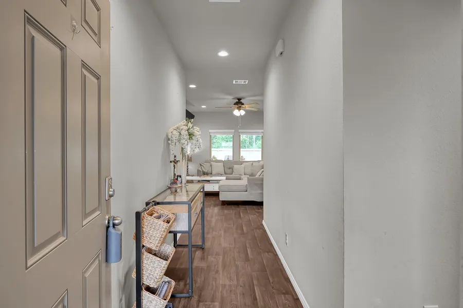 Beautiful 3-bedroom, 2-bath home located in the front section of The Canopies at Harrington Trails! Open-concept layout with spacious kitchen and breakfast bar. Energy-efficient with solar panel/battery system for low electric bills, plus a water softener. Enjoy a large backyard with currently no back neighbors and covered patio for outdoor living. Community offers 2 pools, playgrounds, trails and elementary school within walking distance.