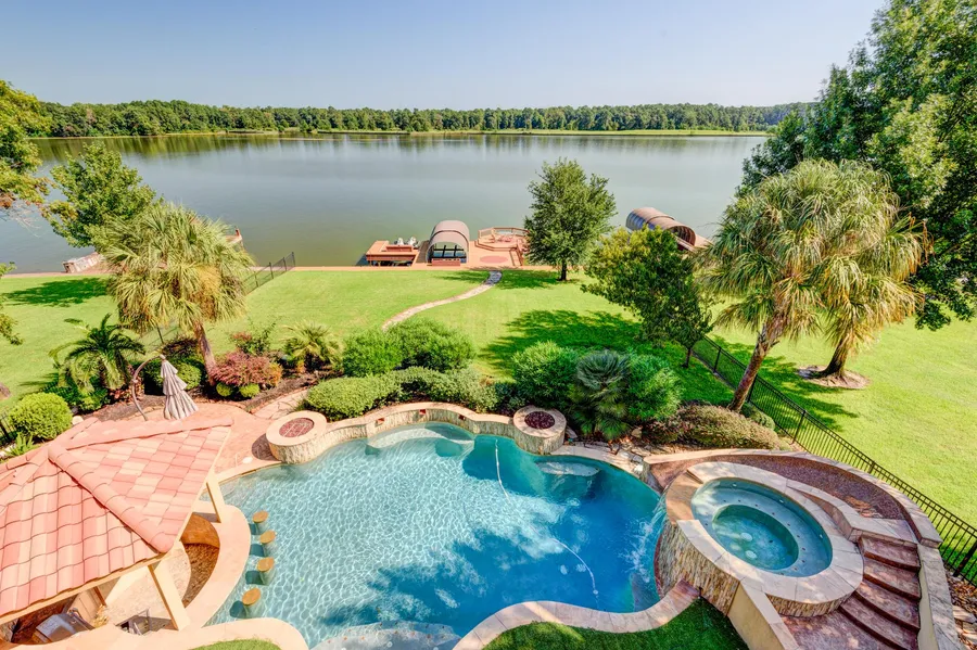 Impeccable Mediterranean style Lakefront home surrounded by custom landscaping & has a 3 car garage. Located in the desirable gated community of Grand Harbor in Montgomery. With 3 stories and a 4th story cupola. Every level has panoramic Lake views and balcony/ patio access to enjoy luxurious Lakeside living. Marble, Travertine, and wood plank floors flow throughout. Don't miss this chance to have your very own home theatre with a 120" projector screen, custom star lighting & built in seating! The 850 sq ft guest apt with its own kitchen, living and dining space is sure to make your guests feel right at home. Additional space of 25"x 15" could be used as a flex/exercise room. Many updates throughout the home and it is in excellent move in ready condition. Central vacuum & controls for whole home automation, 4 level private elevator. 55,000-gallon pool with glass tile slide, covered swim ...
