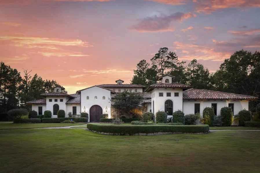 Breathtaking 1-story Spanish estate on 2+ picturesque lakefront acres in Benders Landing Estates! Behind private gates, this architectural masterpiece offers one story living w/4 car garage. Enter through a tranquil courtyard w/brick pavers & fountain to stunning interiors featuring wood & travertine floors, soaring ceilings, archways & surround sound. Gourmet kitchen w/dual soapstone islands, custom cabinetry, Thermador appliances, built-in fridge, pot filler, butler’s pantry & walk-in pantry w/sink. Open family room w/wood beam ceiling, gas log fireplace & sweeping lake views opens to outdoor living space. Private primary suite w/sitting nook & spa-like bath w/soaking tub, 2-way walk-in shower & dual closets. 2 guest suites w/en-suite baths + media room w/full bath (opt 4th bed). Resort-style outdoor living incl saltwater pool/spa, outdoor kitchen, fireplace, fire pit & covered patio o...