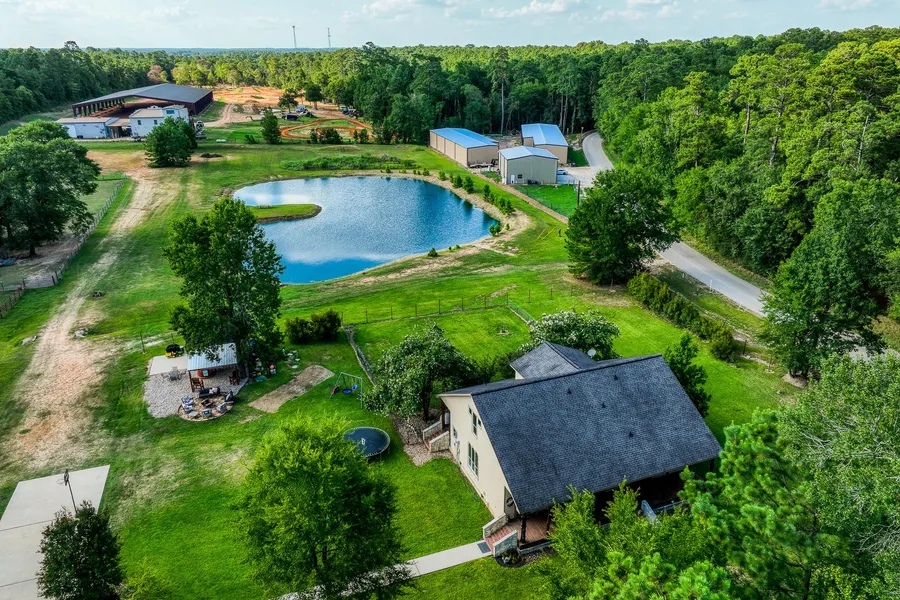 Rare opportunity to find 7+/- unrestricted acres 1.5 miles from Lake Conroe and all the amenities on Hwy 105. The property has a 1-acre pond that is stocked with bass and catfish. It is also cross fenced with a horse pasture, a large yard, and irrigated all around the house with sprinkler systems. The two story 5-bedroom 3-bathroom home has high ceilings, wood floors, and granite counter tops throughout. Upstairs is a spacious game room with a wonderful view overlooking the pond. Outside there is an 18x18 shop with electric and septic hook up for an RV. This is a wonderful chance to enjoy country living without sacrificing conveniences.