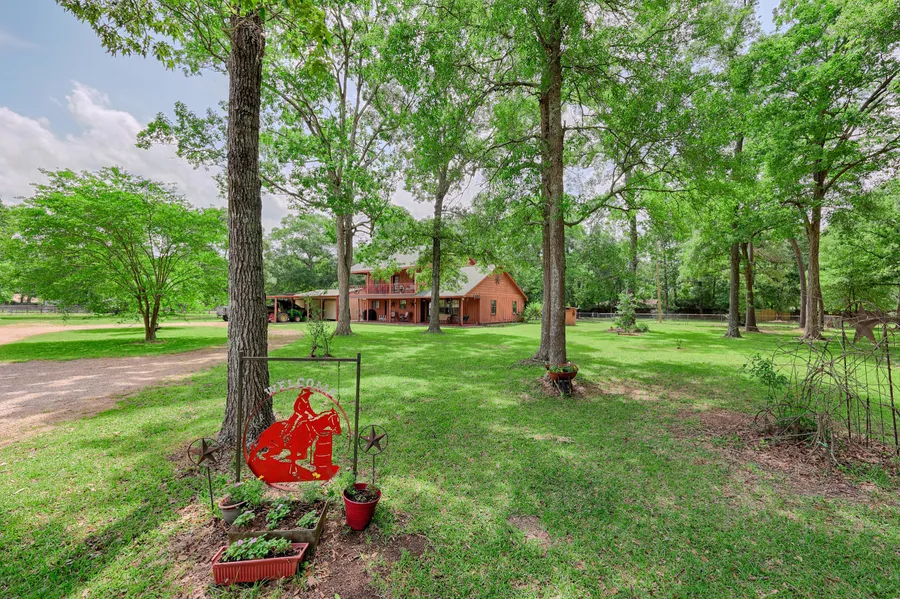 Country charmer with sweeping view of the pastures and pond from front porch swing and balcony. Serene ranchette with mature hardwood trees nestled on 12 fenced & cross fenced acres with pond, 4 bedroom/2 bath home, 38x38 metal barn, round pen, LIT 120x200 ft riding arena, additional small barn/hay storage building, 3 pastures and 3 car garage with attached carport to fit 3 Texas size trucks! Metal barn with underground electric; features 5 stalls with 14 ft concrete alleyway & tack/feed room, built in saddle racks, fans in stalls and mister in barn for cooling plus concrete wash block. Water is piped underground to all livestock areas & dog pen. Property has it's own fresh water well. Two entries to the property, one features automatic gate. RV hookup on the property. All the charm of country living with freestanding wood burning fireplace in family room plus 32x9 upstairs balcony overl...