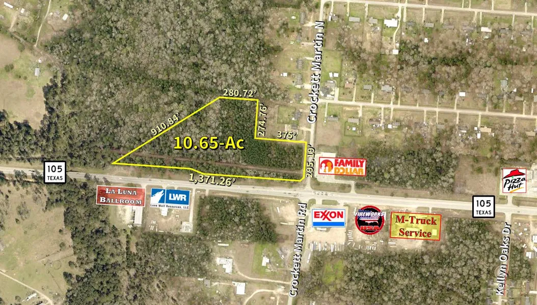 10.65-Ac Unrestricted land on lighted corner with excellent Hwy 105 frontage