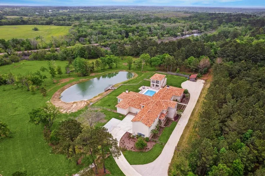 A Tuscan-inspired estate on 28 private, unrestricted acres in the heart of Texas. Timeless architecture, rolling green pastures, and tranquil water views create a countryside escape, just minutes from Bluejack National Golf Club. The main residence features soaring beamed ceilings, European hardwood floors, elegant chandeliers, and walls of windows framing the landscape. A chef's kitchen offers a marble island, premium appliances, and dual ovens. The first-floor primary suite includes a spa-style bath and direct pool access, while a private gym supports wellness at home. A separate two-story guest house provides private living quarters with a balcony overlooking the pool and pond. Outdoors, enjoy a sparkling pool, hot tub, and peaceful pond with dock and fountain. With endless potential for equestrian use, a vineyard, or simply enjoying the freedom of wide-open space, this legacy estate is your private resort - a retreat where every sunset belongs to you.
