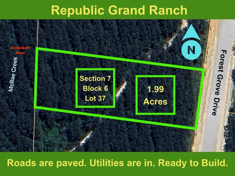 1.99 ACRES > MATURE MIX OF TREES > BACKS TO RESERVE > BEAUTIFUL TERRAIN > Located on the outskirts of Willis with great schools and nearby shopping. Large lot wooded community with gentle rolling hills. Peaceful privacy. You will never be crowded by neighbors. Republic Grand Ranch is a large lot, wooded community in the rolling hills. Country lifestyle for your custom forever home. Trees, paved roads, water, HIGH SPEED fiber optic internet & underground power through out. Covered pavilions, parks, ponds, playgrounds, BBQ areas. Minutes from shopping, dining, schools, hospitals, and entertainment. Low taxes - No MUD tax. Average elevation is 400’ ASL. Plenty of greenspace and trails for hiking, biking and horseback riding.