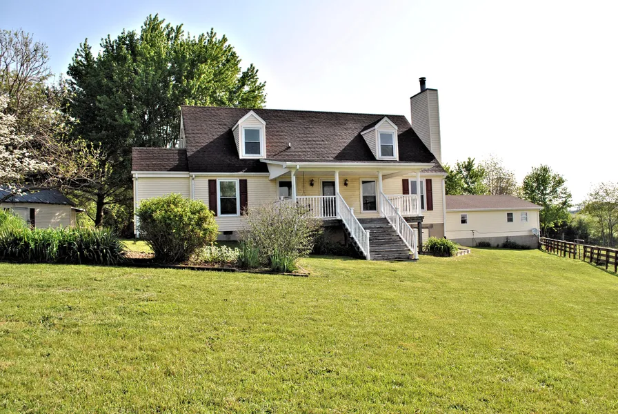 Million dollar views from this four bedroom cape cod on five acres with a detached two-car garage and studio apartment. Gorgeous covered porch overlooking the beautifully landscaped backyard and long range views, deck out front that leads into the mudroom, wood burning fireplace, main level laundry and two bedrooms. Upstairs has a private side entrance and has been completely renovated with new paint, floor and updated bathroom. There is a shed for lawn equipment and tools and the detached garage with an apartment can be used for guests, rental or additional living space. There is fenced space for livestock and a barn that needs some TLC. Plenty of privacy, great views and only minutes to I-81.