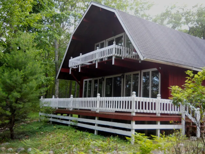 DEEDED LAKE ACCESS Ess Lake, Hillman. 4 bedroom, 2.5 bath, 2 story gambrel style home with full basement on just over 2 acres of rolling wooded terrain. Plenty of windows to let in the natural light. Beautiful exposed wood beams. Natural gas hot water heat. 2 decks, 10x32 front deck and 6x16 second floor deck off on master bedroom. 2 car garage with large loft area for lots of storage. Paved driveway. Deeded access to Ess Lake as well as Long Lake. Great vacation or year round home. $105,000 A-2384
