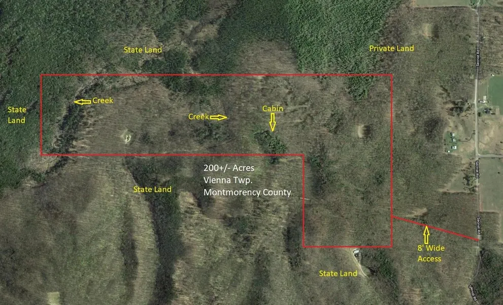 Your Perfect Up-North getaway property! Here is approximately 200 acres in Montmorency County, just West of Atlanta! Located a short drive off of M-32, sits this secluded recreational property perfect for hunting, recreational activities, or just relaxing while enjoying the peace & quiet of northern Michigan! The property is gated and no road frontage other than an access drive off of Secrist Road for privacy! The trail winds through the woods to small rustic cabin that has been very well maintained to provide shelter while at the property. A natural water source exists from 2 separate creeks (1 close to the middle & 1 towards the back/west of the property) that flow into the East Branch of the the Black River, which lies just North of the this beautiful parcel! Larger acreage parcels such as this one are becoming harder and harder to find, so don't delay and call Brandon Podolak at ...