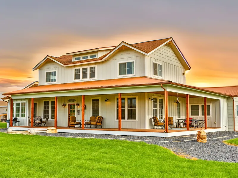 a modern farmhouse, with 3 bedrooms, office, craft room, country kitchen, and wide