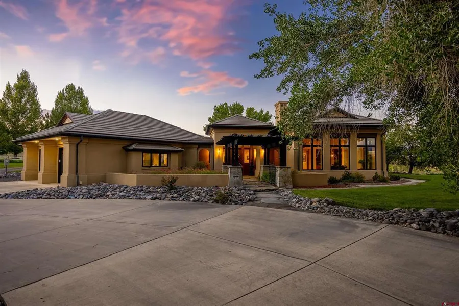 Discover unparalleled luxury in this meticulously custom-built residence, seamlessly blending beauty and functionality. Nestled in a serene cul-de-sac in southwest Montrose, this home is situated on an impressive 5.96-acre irrigated lot within the prestigious Chipeta Pointe community. Stroll down your private path and access to the Uncompahgre River corridor. Your recreation awaits with miles of walking/biking trails, parks, and the Water/Kayaking park. Step into a grand formal dining room and a chefs dream kitchen, featuring exquisite cherry cabinets, granite countertops, a dining bar, a walk-in pantry, and an additional prep sink. The spacious living room boasts a stunning crowned ceiling, custom-built cherry bookcases, a gas fireplace, and soaring windows that flood the space with natural light. Integrated built-in speakers enhance the ambiance throughout the main living areas and the walled courtyard. This home is thoughtfully appointed with solid core alder doors, custom cherry cabinetry, electric blinds, a water softener, humidifiers, a central vacuum system, and a security system. Eco-conscious features include a 10 KW solar photovoltaic system with dual 5100-watt inverters, along with geothermal heating and cooling. The luxurious primary suite includes a cozy sitting area, a versatile adjacent room ideal for a bedroom or office, and a spa-like en suite bath with a tiled steam shower, a Jotul gas stove, and separate sink stations. The guest wing offers two additional bedrooms that each have their own bathroom. A versatile flex room provides options for a family room, guest quarters, or a workout space. A private courtyard seamlessly connects the guest wing to the main house, ensuring ultimate privacy. The homes exterior features low-maintenance stucco, copper guttering, heat tape on a durable concrete tile roof, stamped concrete patios, and flagstone pathways. The property is thoughtfully xeriscaped with rock, perennial plants, and natural landscaping. A fenced garden area, complete with two storage sheds, is perfect for cultivating herbs, vegetables, and berries. The insulated and finished RV garage measures 56 x 36 and includes a mezzanine for holiday storage and a heated workshop area with a 3/4 bathroom. Montrose, Colorado, celebrated for its rich culture, heritage, and breathtaking scenic beauty, offers unmatched recreational opportunities including world-class skiing at Telluride Resort, camping, hiking, biking, fly-fishing, rafting, and jeeping. Embrace a lifestyle of adventure and relaxation in this remarkable home.