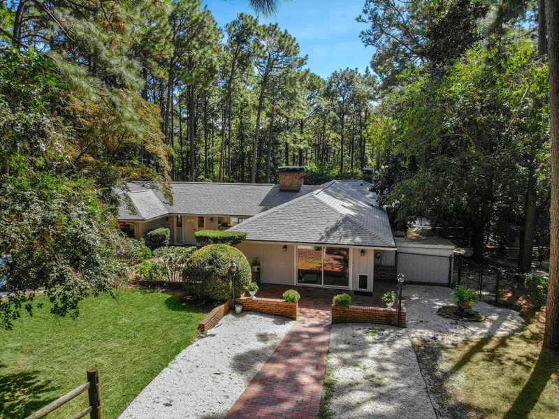 6-acre hilltop setting, 2 miles from downtown Southern Pines, nestled among longleaf pines and perfect for those who crave peace, quiet and privacy in horse country. Gorgeous, renovated mid-century modern home with walls of glass, totally refinished floors, recessed lighting with approximately 3,000 square feet on one level (no stairs or steps). It has breathtaking views, floor to ceiling custom windows and sliding glass doors throughout. Living room with vaulted ceiling and gas fireplace. Dining room with skylights overlooks patio, lawn and woods. Office with large window, sliding glass door and heart pine floor. Master bedroom with gas log fireplace, two large walk-in closets and stunning views of swimming pool and grounds.