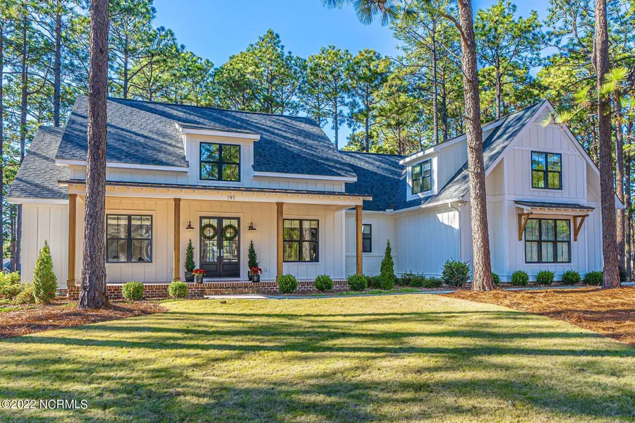 Welcome home to this woodland wonderland, where the warmth of the natural farmhouse aesthetic effortlessly combines with modern luxury amenities. Almost every room inside this 2019-built, two-story home has a window to let in the natural light and view the surrounding landscape of gorgeous mature pine trees and the 17th fairway of the Pinehurst National No. 9 championship golf course. The award-winning, 18-hole course is the only Jack Nicklaus-designed course in the area. When you step inside the double-door entry, you will first see the white oak hardwood floors, tasteful crown molding, and a double-door entry into the formal dining room, which is currently styled as an executive home office. The foyer leads you to the open concept kitchen and great room with a soaring 18-foot vaulted ceiling. The living room with modern circular chandelier and white oak beams has ample room for seating in front of the fireplace. The stylish light kitchen features a quartz center island with farmhouse sink, custom inset cabinetry, subway tile backsplash, Thermador double oven with gas stovetop, hidden built-in Thermador refrigerator, a large butler's pantry with farmhouse sink and window. You will love starting your mornings in the cozy breakfast area flooded with natural light from the large windows. Beyond the living area is the private rear porch with vaulted wood ceiling and large ceiling fan. On the eastern edge of the home is the master suite fit for royalty. White oak beams on the vaulted 18- foot ceiling encapsulate the spacious master bedroom, where custom woven wood shades perfectly filter the right amount of sunlight. The master bath includes his-and-her sinks, ceramic tile shower with two showerheads, and soaking tub. Through the bathroom is the dreamy 18-foot-long walk-in closet. The enclosed laundry area completes the master wing of the home. The secondary bedrooms make up the west wing of the home. Each bedroom is fitted with a walk-in closet and share the second