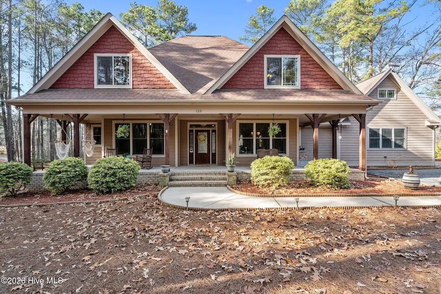 Welcome to paradise! This beautiful custom-built home is perfectly situated on 2.43 acres just outside of Carthage in a quiet subdivision offering a peaceful country feel. This award-winning home, recognized by the Home Builders Association for excellence in its category, features exceptional craftsmanship and fine finishes throughout. From the inviting wrap-around front porch, step into the foyer with views that immediately draw your eyes to the tranquil pond through large living room windows. The main living area boasts gleaming hardwood floors, with a spacious living room centered around a stunning floor-to-ceiling tiled gas log fireplace flanked by built-in cabinetry. The foyer is open to a formal dining room with wainscoting and chair rail trim, mirrored in the office/study with French door entry from the foyer. A beautiful kitchen awaits with granite countertops, custom cabinetry, stainless-steel appliances, island with built-in microwave, and breakfast nook framed by a bay wall of windows. There is also a custom walk-in pantry by the laundry room. The private main-level primary suite is a nice retreat with peaceful pond views and a spa-like en-suite bath with dual granite vanities, jetted garden tub, tiled step-in shower and a walk-in closet with built-ins. A stylish powder room and a unique built-in dog pen with wrought iron gate is just down the hall under the stairway. Upstairs, you'll find a large bonus room, three spacious bedrooms - all with walk-in closets, and two full bathrooms, offering ample room for family, guests, or hobbies. The oversized two-car garage includes a third bay ideal for boat storage or a workshop space. Step out back to enjoy a large, screened porch overlooking the backyard with fire pit and scenic views of your private pond, perfect for relaxing evenings or outdoor gatherings. Just 15 minutes from Pinehurst! Don't miss this one-of-a-kind property where quality meets tranquility!
