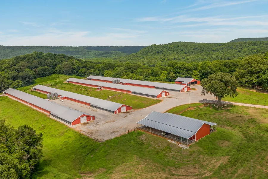Gorgeous 110 +/- Acre Poultry Farm! 4- 40x500 Broiler Houses with 2 Dry Stack Barns. One Barn is 40x60 and the other is 40x100 with 2 open Sheds on each side. The Custom Built home is so pretty with vaulted and 10' ceilings throughout, all hardwood or tile floors, tankless water heater, spray foam insulation, metal roof, and Fiber internet. There is a gorgeous log barn on the property as well. This is a rare chance to own such a gorgeous farm and home!
