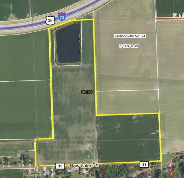Research Parcel InformationFrom 267 S out of Jacksonville, IL take 31/New Lake Rd 1 mile East. Farm to N of New Lake Rd.