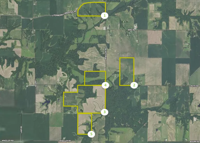 The largest of the five tracts, this tract requires a bit more explanation. Between the tillable farmland and CRP, 137.83 acres are income-producing. With nine acres of CRP for deer to bed down in amidst the timber and adjoining woodland, the hunting potential for this tract is significant. Two pole-frame buildings provide 5,136sqft of covered outdoor storage, and five older grain bins total 20,000/bu onsite grain storage. This tract has excellent build-site potential, with rural water already running to the property. The current farm tenant has occupied the older home on this tract for 49 years, and has interest in staying should the new owner desire.