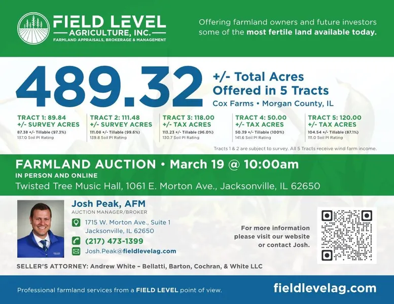 Tract 2: 112.66 acres, 139.8 PI, 99.6% tillable, Ipava, Osco & Muscatune soils; Jacksonville TWP