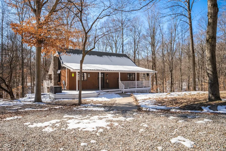 Escape to your private 40-acre wooded sanctuary! This custom-built home offers a tranquil retreat with rolling hills and hiking trails with scenic ravines. Enjoy seeing wildlife such as deer, wild turkeys and birds in their natural habitat from the wrap around covered porch on the front and back of the home and back lower level patio with hammock, perfect for listening to the birds while you relax or head over to the firepit on cool nights. Inside, the home boasts vaulted wood-lined ceilings with beams and poplar hardwood floors in the upper level. The primary bathroom features dual pedestal sinks, hall bath offers a claw foot tub, to take you back in time. Three bedrooms and three bathrooms provide ample space, with the versatile second main floor bedroom adaptable as a closet/nursery/office. The lower level includes a den, laundry, storeroom, and a generously sized bedroom with a full...