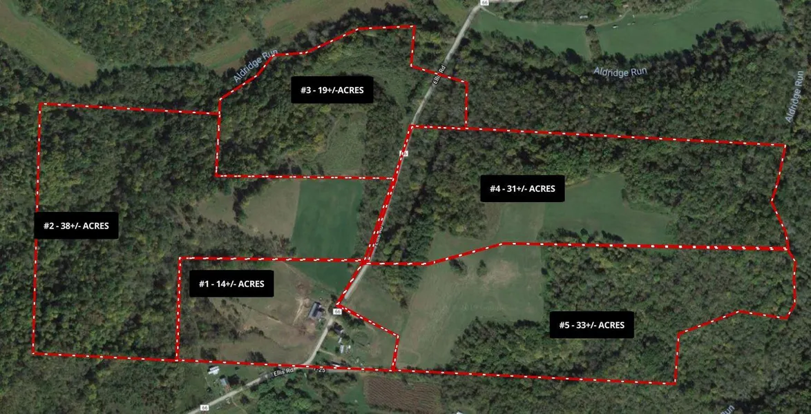 TRACT #5 claims 33+/- acres with frontage on the eastern side of Ellis Rd. Once again, this tract has both open and wooded acreage.