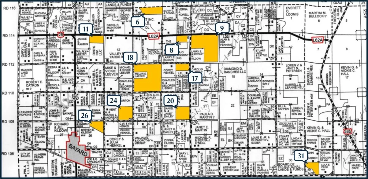Research Parcel InformationSECTION 6: From Bayard, Nebraska 3 1/2 miles North on Hwy. 26 to Jct. then 2 miles East on Hwy L62A to CR 79 then 1 mile North and 1/8 mi. East on North Canal Road.