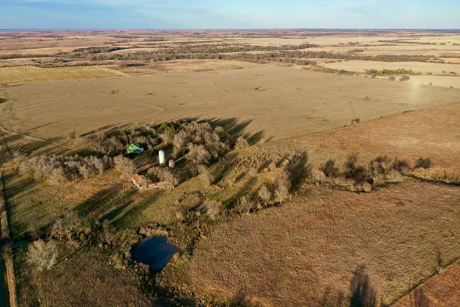 44 of the acres are native Bluestem grass that has been grazed. The draw that runs throughout the middle of the pasture feeds the spring-fed pond that is located in the southwest corner. According to the family, this pond never freezes over in the winter due to the running spring, which meant no breaking ice at chore time to get water for the horses. The pasture is fully fenced along the perimeter and it is fenced off from the tillable acres and comes up to the barn and corral area.