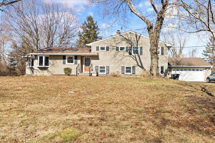 Custom split with skylit updated eat-in kitchen open to the living room and dining room, HW floors, deck, central air and 1st floor office/4th bedroom perfect for working from home. Oversized two car garage and level private lot