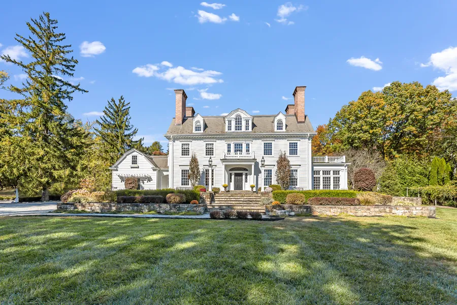 Experience the timeless allure of Georgian Colonial architecture reimagined for modern living. Set back on 2.65 acres of lush grounds Georgian design elements begin at the grand portico continuing indoors to the dazzling 3-level elliptical staircase, nine layer crown moldings, divided light restoration glass windows, nine fireplaces, 10' ceilings, and hardwood floors mined from the estate's trees are on all levels. Expansive conservatory adjoins formal living and dining rms. New kitchen aglow with quartz countertops, 10' island, professional appliances, baker's counter, fireplace. Large informal dining area with fireplace. Primary suite with sitting room, luxurious bath, two walk-in closets. Large dressing room custom fitted for the most sizeable wardrobe. Ensuite office/bedroom with extended custom desk. Three additional bedrooms each with a fireplace. True Palladium windows or wide win...