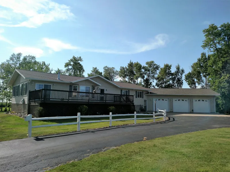Enjoy the peace & quiet this meticulous property provides! 5 acres, extensively landscaped with bridge, backyard fire pit and patio. 14x40 front deck, tarred circle drive. Home boasts vaulted ceilings, custom cabinets, stainless steel appliances, hickory floors, & attractive sun room with wood floors & tile inset. Lower Level family room with wet bar, hobby room, huge storage room, 3rd bed room & bathroom. 30x54 detached garage, 22x30 insulated & heated, & 10x30 covered area. Truly a must see!