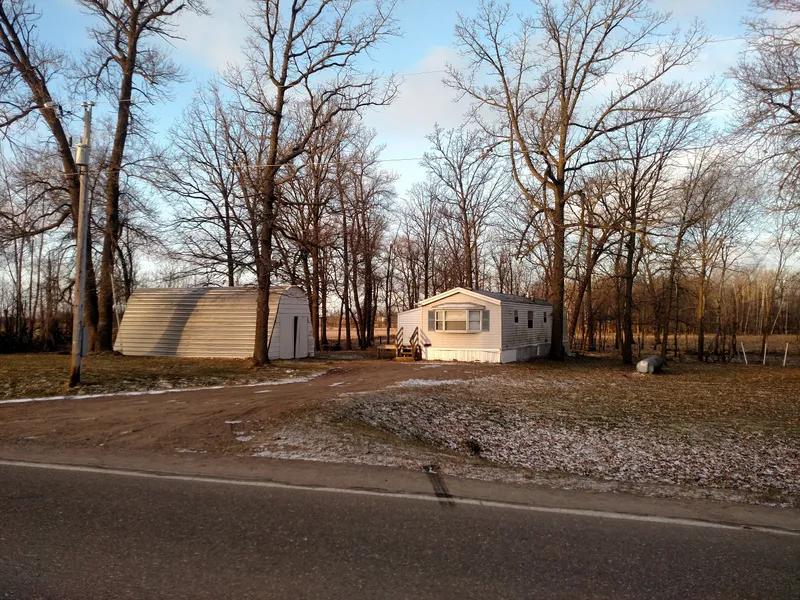 Seller will survey 5 acres, this is currently part of a larger parcel. Affordable country living in this 2 BR, 1 Bath mobile home. Mobile home features pitched, shingled roof, skirting, open layout with vaulted ceilings in kitchen and living room. Tons of kitchen cabinets. Comes complete with appliances. Detached garage, compliant (see supplements) mound septic system and drilled well. Wonderful wooded setting!