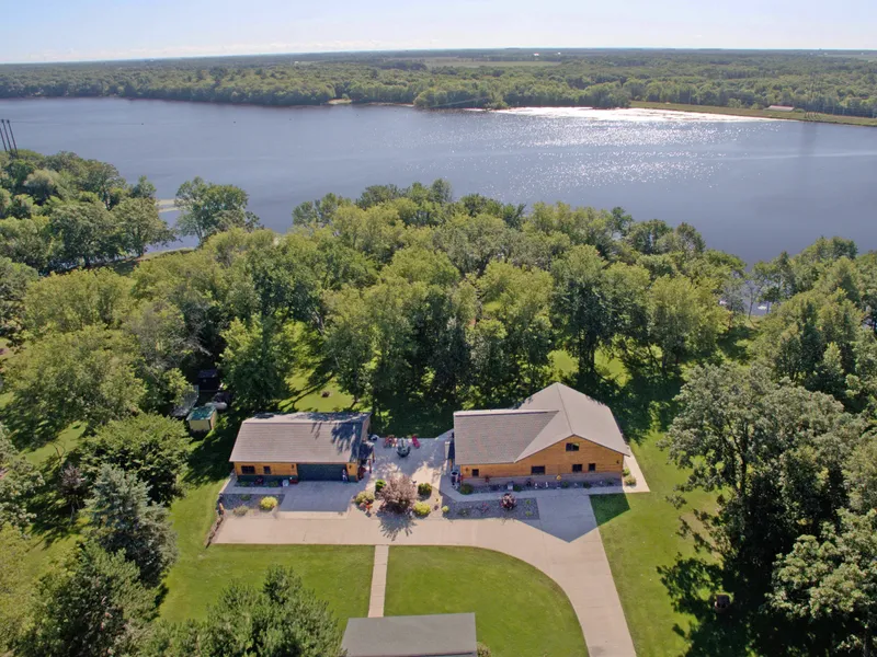 Your perfect river-front estate: 5 park-like acres with newer bldgs incl a spacious home featuring exquisite views; 2 garages-both fully finished /heated-one w/guest quarters(kitchen & bath); lots of patio space is ready for time outdoors. The 3rd BR is currently set up as a family room in the loft-just needs a wall to make if fully private. Plenty of space for entertaining inside with an open concept living area. Check out the river side wall that is angled to a point to provide maximum views!