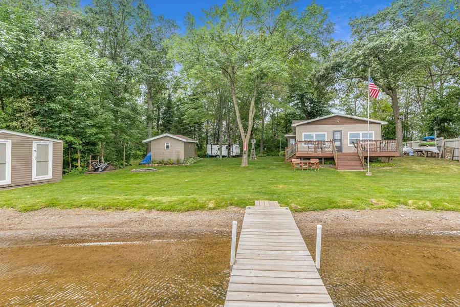 Inviting two bedroom two bath Long Lake home with perfect level elevation to the waters edge and 102 feet of shoreline. This lake home has everything you want with knotty pine interior, up north character, open kitchen, informal dining, lake facing primary bedroom, yard with space for games, new roof, storage shed for the water toys, sand beach and much more!