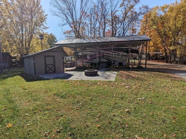 Everything you could want for the perfect seasonal getaway! 2013 Montana Big Sky 5th wheel 40', 26x48 roof-over with 24'x54' slab: 13'4'' height. 10'x20' storage building with electric, fridge and freezer. Also, concrete patio with firepit. All water and electric updated with underground lines, in 2017. French drain installed in front of property for proper drainage. Includes all amenities of Candlewood Lake.