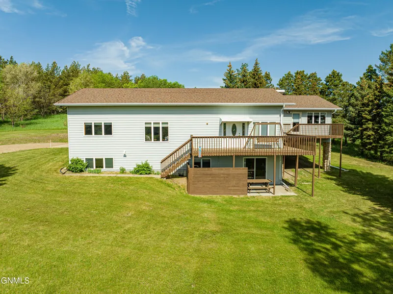 This is it! A beautiful custom home nestled among almost 180 acres. This property leaves nothing to be desired. Starting with the home, this 3360 sqft ranch style home has a unique but highly functional layout. As you approach the front door the wrap around deck greets you providing a wonderful place to enjoy the sights and sounds of your sprawling yet private homestead. From here the view can not be beat whether it's the western sunsets or the eastern sunrises this will be the vantage point to appreciate it all. When entering the property you have access to two living spaces uniquely separated by an elevated dining peninsula. The left side offers a large picture window and quiet place for reading or conversing. The right side has a short staircase leading to the warm open kitchen, with large center island, pantry and all the countertop space you will ever need. Also, off the kitchen is an additional access to the large deck and the first of two primary suites. To the other side and down the hall you will find a half bathroom, second primary bedroom and laundry room with access to the garage. Both primary bedrooms have full primary ensuites with whirlpool tubs, stand alone showers and dual sink vanities. The lower level of the home starts off by offering a comfortable family room featuring a dynamic rock fireplace and the perfect viewing place for movie nights. We also find 2 more bedrooms, an office space and another full bathroom. The mechanical room and additional storage under the stairs continues to impress with this home's ability to provide all the utility in a well thought out manner. As if on que, we point out the walkout to the covered patio where you have the opportunity to enjoy your sanctuary from ground level.The oversized double garage offers high ceilings and a large enclosed closet for all your storage needs. This bonus storage place can be the perfect place to store all of the necessary items required to fully enjoy our dramatic North Dakota seasons. Moving outside, this property includes two parcels of land. The South portion includes the house and 91.27 acres with many mature trees providing complete privacy. Also included is a large shop measuring 30 x 40 and featuring a 9' door, propane heat, water, 100amp service with 220 outlet, and insulated walls. The second outbuilding is a horse barn with 6 stalls, tack room and feed hopper. This building also has 100amp service and a 220 outlet. The third outbuilding is a grain bin on a foundation for additional storage needs. The North portion includes 81.95 acres of endless opportunity. To top it off Crown Butte Dam is within walking distance from your property. Here you can enjoy canoeing, fishing, and camping.Additional features/updates of the property includes, new roof 2022, new carpet 2020, kitchen remodel 2014, whole house reverse osmosis system, and new shop windows in 2022. If your looking for a rural property close to town, with a beautiful private homestead and sprawling spaces to boot. this is it! Call an agent today to ''ADDRESS your Future''.