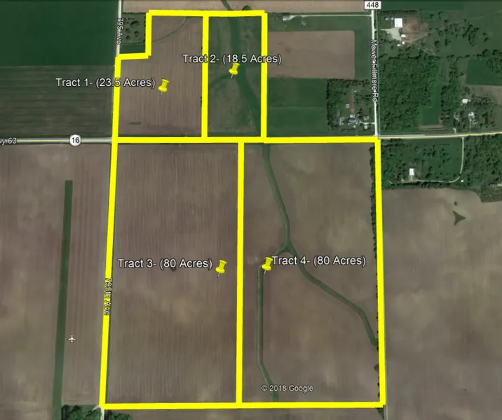 Tract 1 consists of 23.5 Acres approximately 23 tillable with a 92.6 CPI rating. The parcel has excellent access and exposure as well good frontage to Hwy 63 and good road along its western boarder.