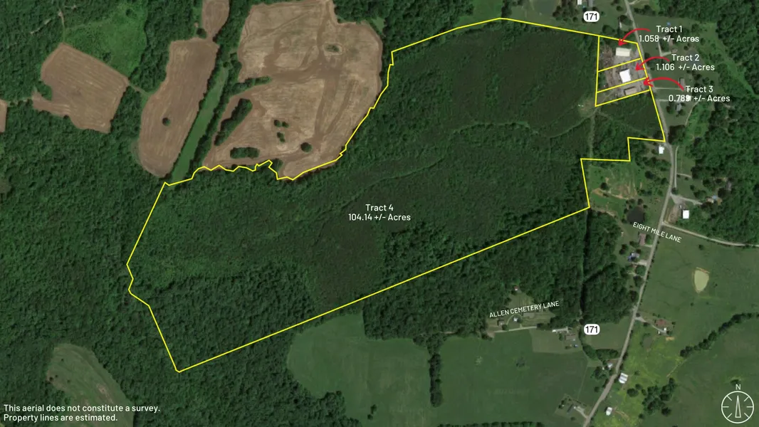 107 +/- total acres in 4 tracts. Tracts may be sold separately or together. Tract #1 listed at $84,200 features: 100' x 60' Metal Open Span Shop Building with 2 - 14' x 14' doors w/ electric door opener on 1.058 +/- acres. Tract #2 listed at $84,200 features: 63' x 61' Metal Shop Building with office - 12'6 x 11'7, break room - 21' x 10'8, storage room #1 - 21' x 24', storage room #2 - 28' x 24' and concrete floors on 1.106 +/- acres. Tract #3 listed at $78,900 features: 80' x 40' Metal Shop Building on 0.789 +/- acres. Tract #4 listed at $179,600. Acreage!! 104.14 +/- acres. Great hunting property.
