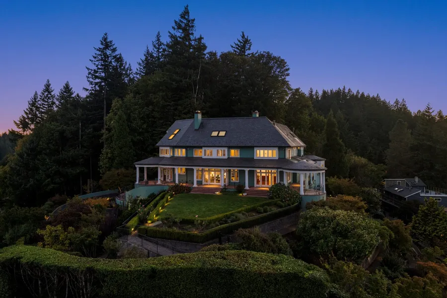 Perched at the highest point in Kings Heights on 1.55 acres, this remarkable Green Gables built estate captures breathtaking 270-degree views of the Portland skyline, the Cascade Mountains, and the Willamette and Columbia Rivers. Crafted with top-of-the-line materials, the home features copper gutters, slate roof, and a smooth stucco exterior. Beyond the grand gated entry, a sweeping driveway leads to two separate two-car garages, two peaceful water features, terraced gardens, and an expansive front lawn overlooking the city and mountains. A fully fenced, graveled walking path encircles the property and its rose gardens, enhancing both charm and privacy. Inside, the main level is anchored by custom stained-glass detailing, including a striking skylight centerpiece above the entryway. The formal living room centers around a gas fireplace, while the formal dining room showcases cherry wood...