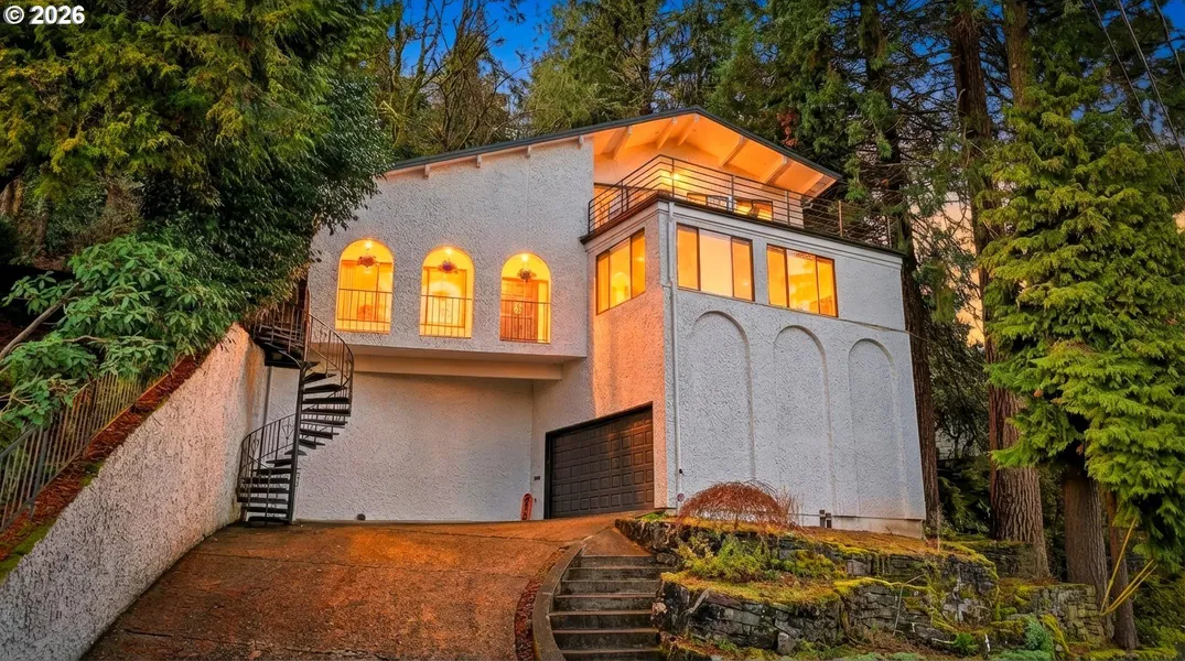 Kings Heights' most unique home and affordable home, perched high in the hills with breathtaking, million-dollar views of the Willamette River and surrounding mountains. This Mediterranean-style home is a true artist's retreat and features a classic stucco exterior and metal roof, while the interior is light-filled and inviting with a flexible, functional floor plan. The main level offers an open layout with vaulted ceilings and skylights, creating an airy, sun-drenched living space. The newly renovated chef's kitchen is equipped with luxury Cafe appliances including induction range and designed for both everyday living and entertaining. A spacious bedroom suite on the main level can also serve as a second living room or office, complete with inspiring views. New flooring extends throughout the main and upper levels. Upstairs, the primary suite features a stunning bathroom and a large private balcony that captures sweeping views, along with a third bedroom. This home is ideally located just a 7-minute walk from the trails of Portland's beloved Forest Park, while remaining steps away from everything Northwest Portland has to offer. An oversized two-car garage is wired and ready for your electric vehicle charger, completing this exceptional home. Exciting! [Home Energy Score = 1. HES Report