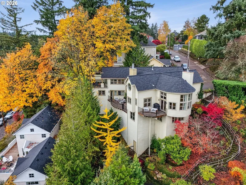 OPEN HOUSE, SAT, 2/21, AND SUN, 2/22, 12-2PM! At the end of a dead-end street in the coveted Portland Heights neighborhood, a contemporary retreat awaits. Custom ironwork by artist Lee Kelly frames the entry, a sculptural invitation that hints at the thoughtful design within. Step through the door & you're met w/soaring ceilings, gleaming hardwood floors, & unique architectural windows that pour light into every space. On the main level, the kitchen serves as the heart of the home. Outfitted w/Stone counters, stainless steel appliances from Jenn-Air and Wolf, & a comfortable eating area that seamlessly opens to the family room. A gas fireplace, custom built-ins, and French doors to the first of three view decks create a space perfect for both quiet mornings and lively gatherings. The formal dining room completes this level. Down a half level, the living room expands on the home's sense of space & light. Floor-to-ceiling windows frame the treetops and views, while another gas fireplace adds warmth and ambiance. French doors lead to yet another deck for an ideal perch to take in the serene greenway below and spectacular views of Mt Hood. This level also hosts a welcoming guest bedroom, a full bath w/a marble vanity, a dedicated office, & the laundry room w/ample storage & counter space. Continue down to a versatile bonus level & an ideal second family room, fitness studio, creative workspace, or optional bedroom. Upstairs, the primary ensuite feels like a private sanctuary. Vaulted ceilings lend a sense of openness while the walk-in closet provides generous storage. The spa-inspired bath offers a marble double vanity and a two-headed shower system. There is access to a third deck, where sweeping views of the Oregon landscape create a breathtaking daily ritual. Low-maintenance, upgraded gardens create quiet beauty and showcase another Lee Kelly sculpture. This is a rare opportunity to live in a place where architecture, nature, and design come together in harmony. [Home Energy Score = 4. HES Report