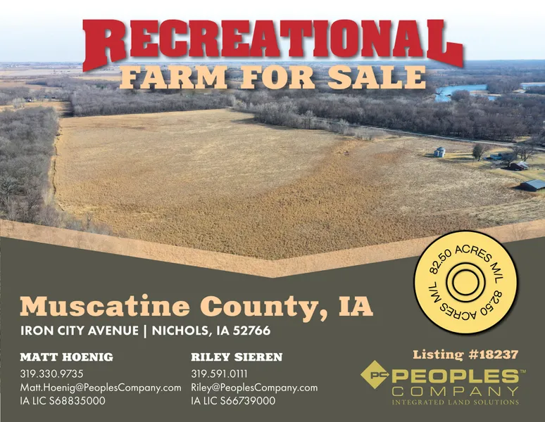 Peoples Company is pleased to present 82.5 acres m/l located between Nichols & Muscatine, IA. This property is a recreational paradise consisting of 73.75 acres m/l enrolled into CRP with an annual payment of $15,336. Containing a mix of native grasses allows abundant wildlife to use this property as a travel corridor, including whitetail deer, turkey, pheasants & waterfowl. Whether you are looking for that perfect place to call home, a secluded weekend getaway, or a year-round recreational property, this may be the one that you've been searching for. The farm consists of 73.75 cropland acres carrying a CSR2 rating of 28.2. The property has been in the Fridley family for nearly 78 years.